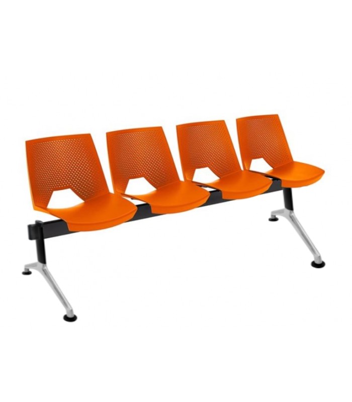• Bancada de 4 plazas con carcasa monoblock fabricada en polipropileno de alta resistencia, con respaldo perforado que mejora la transpiración. Higiénica y fácil de limpiar, brinda comodidad y un toque moderno en recepciones o salas de espera.