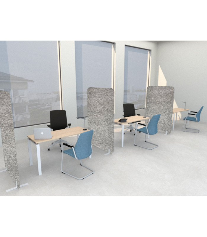 Los biombos acústicos están fabricados de un material decorativo ideal para absorver el sonido. Su componente principal es la fibra de pet, fonoabsorbente, aislante, antimoho, fácil de limpiar y respetuosa con el medioambiente. Su elegante acabado con líneas verticales y esquinas redondeadas aporta un toque moderno y sofisticado. Ideal para quienes buscan privacidad, confort y un diseño estético en su espacio de trabajo.