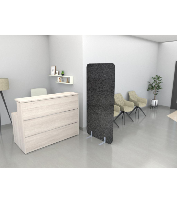 Optimiza tu espacio de trabajo con este biombo  panel acústico, diseñado para mejorar la privacidad y reducir el ruido en oficinas, salas de reuniones y espacios de trabajo compartidos. Su elegante acabado con líneas verticales y esquinas redondeadas aporta un toque moderno y sofisticado. Fabricado a base de PET (Tereftalato de Polietileno), procedente de materiales reciclados. Cuenta, además, con unos soportes para la base en acero, en color negro, gris y blanco. Ideal para quienes buscan privacidad, confort y un diseño estético en su espacio de trabajo.