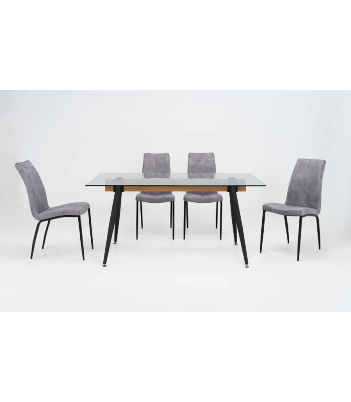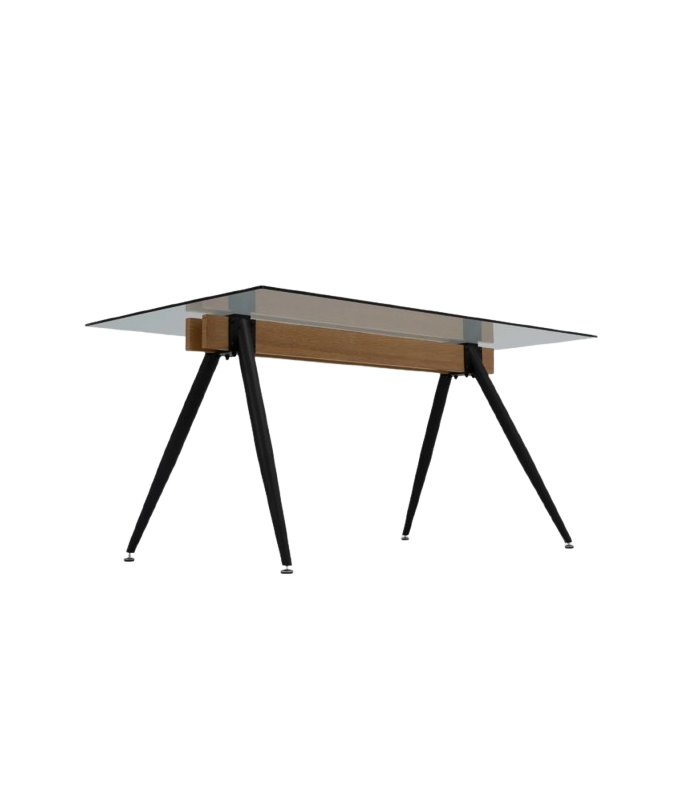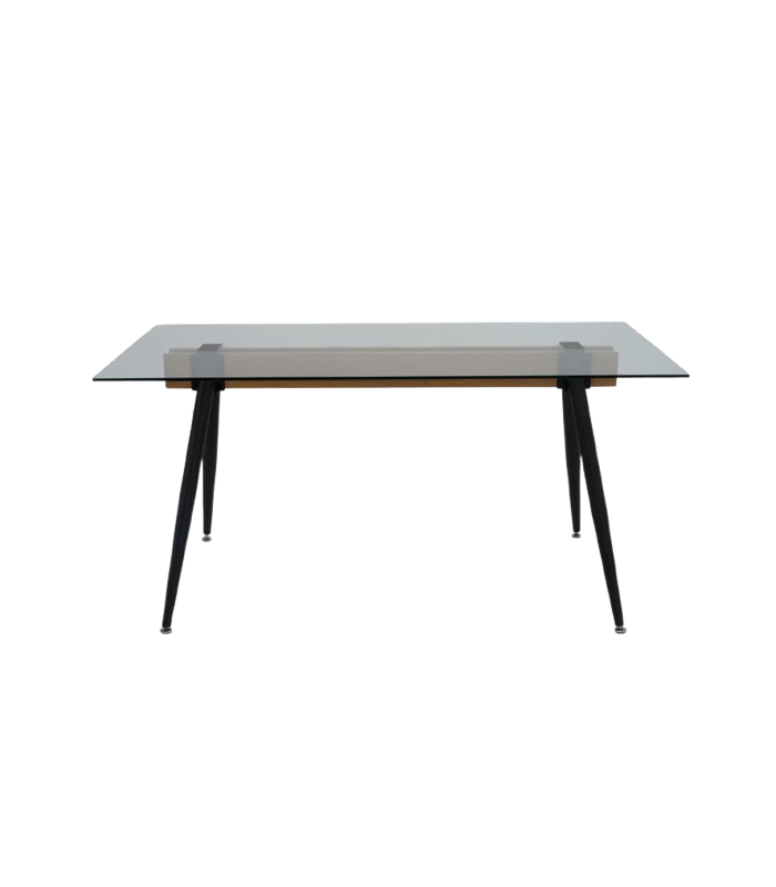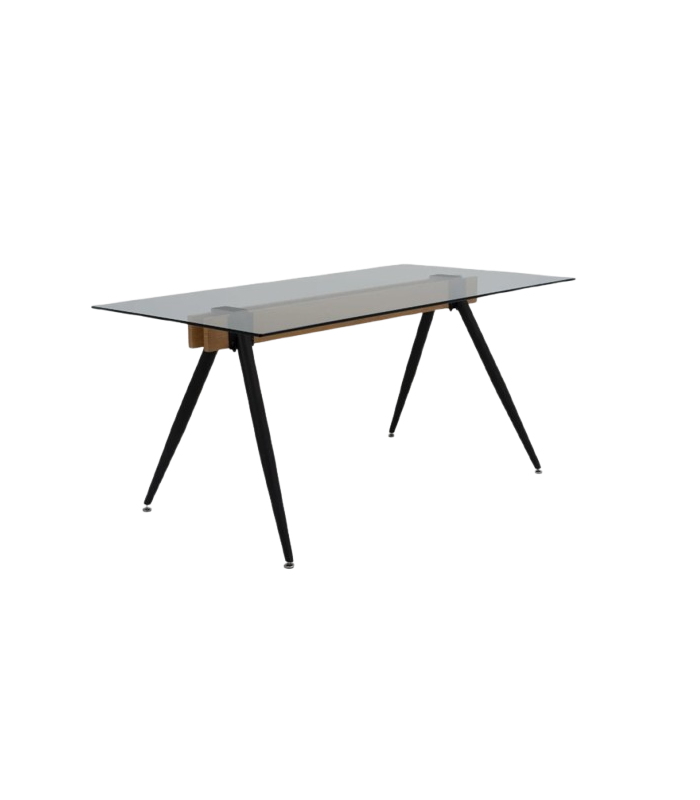 Añade estilo y funcionalidad a tu hogar u oficina con esta sofisticada mesa de cristal rectangular. Su superficie de vidrio templado ofrece una estética ligera y moderna, mientras que su estructura con patas de acero en color negro en ángulo aporta un diseño elegante y estable. El detalle en madera debajo del cristal añade un toque cálido y contemporáneo, ideal para ambientes que buscan un equilibrio entre lo industrial y lo acogedor. Perfecta como mesa de comedor, escritorio o espacio de reuniones.