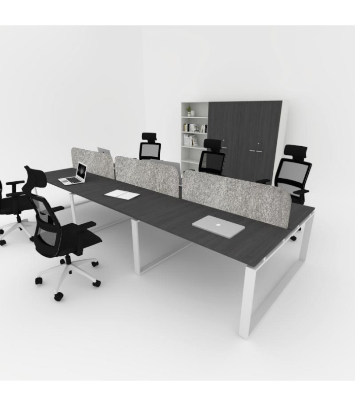Diseñadas para fomentar la colaboración y mantener el orden, estas mesas operativas multipuesto combinan estética moderna con máxima eficiencia. Su estructura metálica robusta y los acabados en melamina de alta calidad garantizan durabilidad y una superficie amplia para el trabajo diario. El diseño compacto aprovecha cada metro cuadrado, mientras que los paneles divisorios con propiedades acústicas crean un ambiente profesional y enfocado. Perfectas para oficinas contemporáneas, espacios de coworking y entornos laborales dinámicos. Además, ofrecemos la opción de añadir pasacables, que se pueden encontrar en el menú de complementos, dentro de la categoría de mesas de oficina.