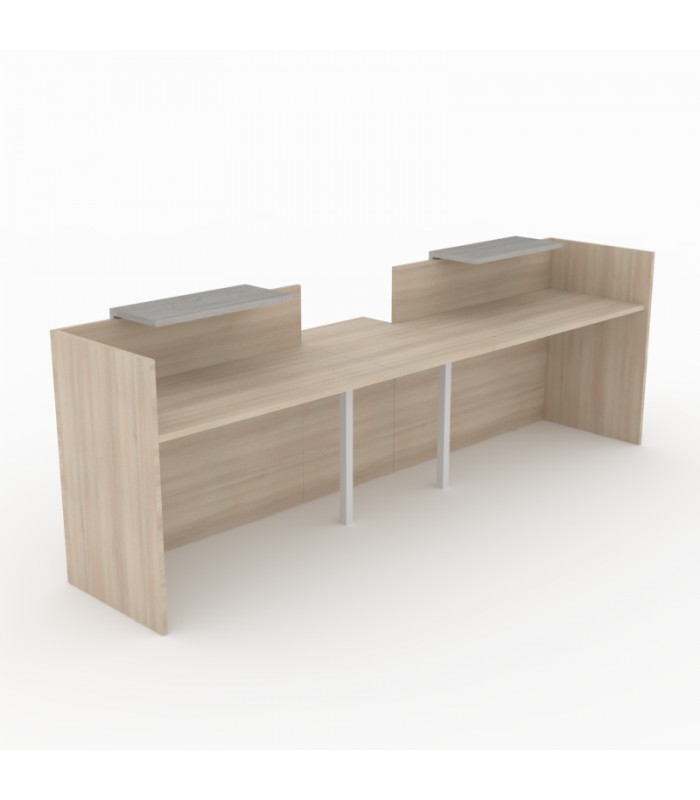Ya hemos comentado, en otros modelos de mostradores, que la primera imagen que recibe el cliente es la de tu mostrador de recepción. Debemos tener en cuenta que la funcionalidad que es muy importante para el trabajador, pero no olvidemos de que también debe ser funcional para el cliente o visitante que llega a ese mostrador. En la línea de mostradores inclusivos, este modelo marca la diferencia sin duda, al contar con una zona baja adaptada a las personas con necesidades especiales, y el cliente se puede sentir fácilmente identificado con solo tener presente este punto. La parte de atención para personas con movilidad reducida, hacen de este mostrador una abanderado de la inclusión. Fabricado completamente en melamina de alta calidad, con un colorido muy adaptable a cualquier entorno de oficina. En este modelo, además hemos cubierto la zona de trabajo, con laterales altos, para dar una mejor disponibilidad a la zona de trabajo. Fabricado en melamina de 25mm. Los sobremostradores en tablero syncron, con texturas al tacto, refleja una imagen muy natural y atractiva. Posibilidad de llevar pasacables, encontrará los que tenemos disponibles en el menú complementos, dentro de la categoría de mesas de oficina.