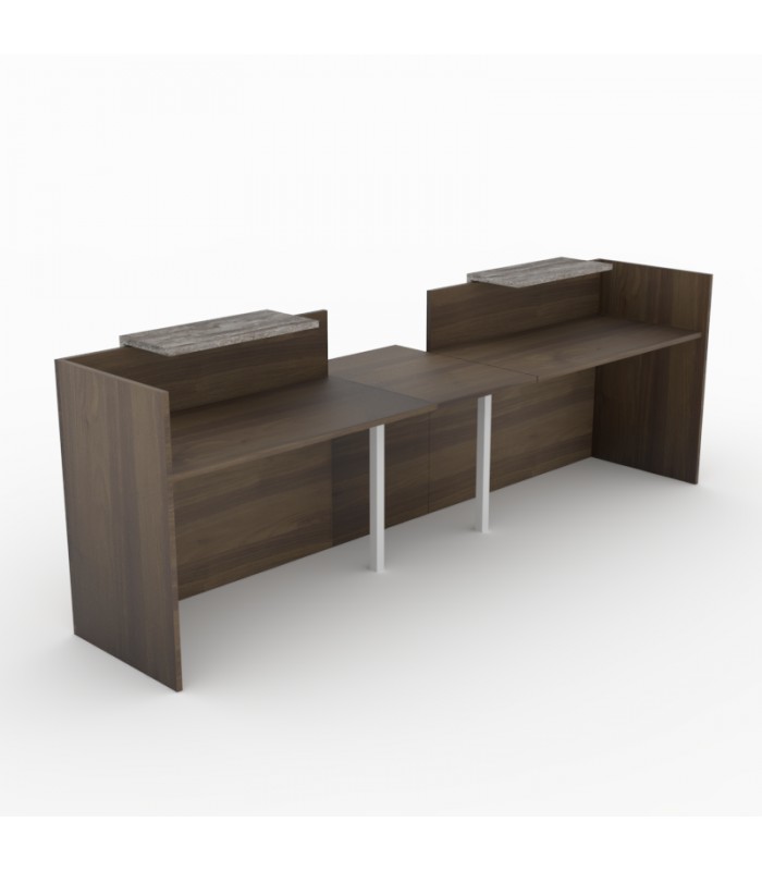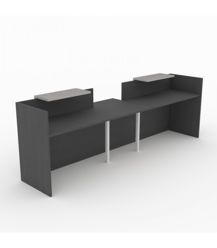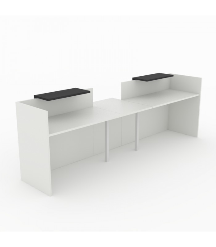 El mostrador DROME TWIN SY incluye una mesa baja central que puede servir como espacio de trabajo y permite un uso eficiente del área, pero no presenta almacenamiento cerrado.