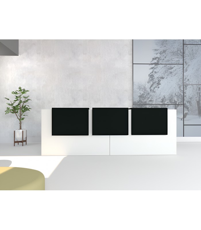 Seguimos en la línea de mostradores con una imagen moderna y atractiva, con una calidad excelente y una imagen visual que no pasa desapercibida. Este mostrador se diseña con unas medidas pensando en las recepciones que necesitan más personal para su atención. Dispone de 3 sobremostradores, con un colorido a elegir que destaca por los colores atrevidos y que diferencian claramente los puestos de trabajo de atención y facilitan el acceso de los clientes al punto donde pueden ser atendidos.