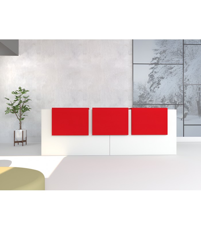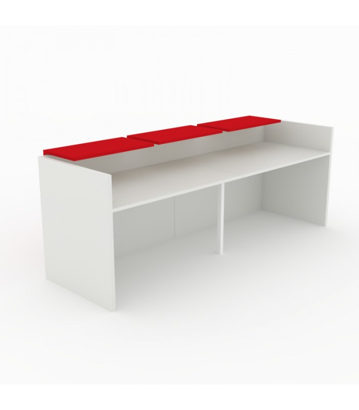Seguimos en la línea de mostradores con una imagen moderna y atractiva, con una calidad excelente y una imagen visual que no pasa desapercibida. Este mostrador se diseña con unas medidas pensando en las recepciones que necesitan más personal para su atención. Dispone de 3 sobremostradores, con un colorido a elegir que destaca por los colores atrevidos y que diferencian claramente los puestos de trabajo de atención y facilitan el acceso de los clientes al punto donde pueden ser atendidos.