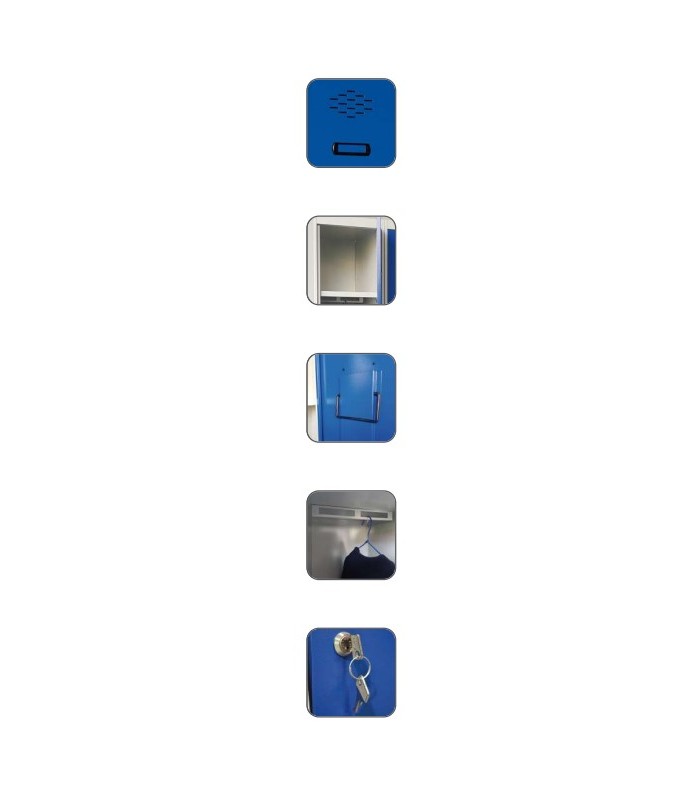 Os armários de vestiário com uma ou mais portas em coluna possuem uma barra para pendurar roupas, por isso são conhecidos como roupeiros. Eles têm grelhas de ventilação nas portas. São armários usados em vestiários e espaços públicos para guardar objetos pessoais, como roupas, sacolas esportivas, bolsas, capacetes, livros, etc. Cada vez mais empresas de trabalho administrativo, como escritórios, estão se preocupando em oferecer aos seus funcionários um espaço adicional para guardar seus objetos pessoais, fora de seus postos de trabalho. Eles são fabricados em unidades de um corpo, os mais comuns, ou em vários corpos, que são colocados formando baterias de múltiplas unidades. Este modelo possui 1 porta.