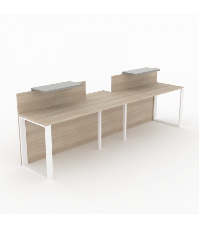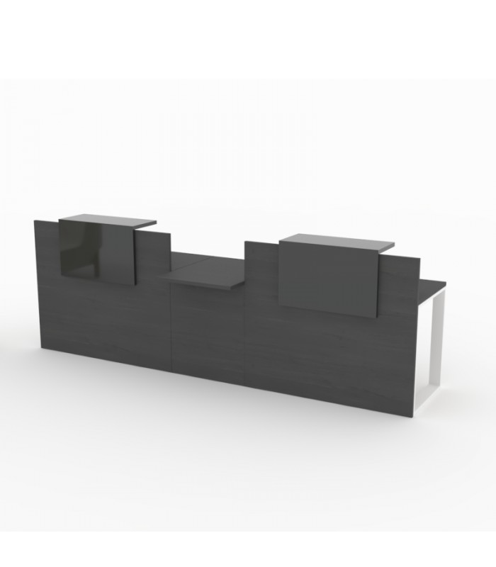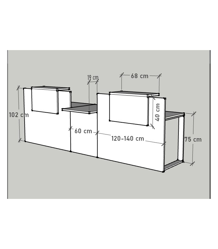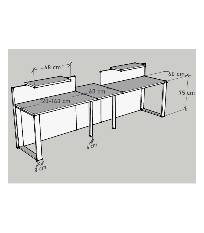 O Balcão Drome DL é fabricado com um tabuleiro bilaminado de 25 mm de espessura e é composto por 3 módulos: 2 altos e 1 baixo. Possui dois apoios laterais de perna metálica com estrutura fechada, que têm uma altura de 75 cm. Também inclui uma mesa baixa central de 60 x 75 x 60 cm, que se conecta às mesas dos módulos altos por meio de pernas metálicas independentes de seção de tubo 40x40mm, fixadas diretamente à junção das tampas da mesa. As mesas internas dos módulos altos têm uma profundidade de 60 cm. As tampas das mesas não são marcadas, pois devem ser ajustadas à altura do módulo baixo, que determina o nível das tampas das mesas internas.