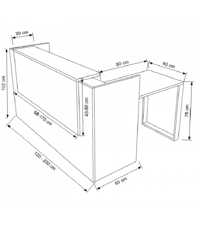 • Balcão frontal: 140-160-180-200 x 102 x 60 cm (comprimento x altura x profundidade)