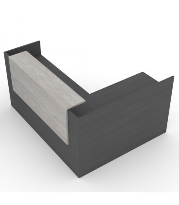 Este balcão é fabricado com painel bilaminado de 25mm de espessura e tem uma altura de 102 cm. Inclui um fecho lateral de 102 cm de altura por 60 cm de profundidade, uma mesa que forma um L com perna metálica de apoio e frente de melamina de 102 cm de altura. A mesa interna da frente principal tem uma profundidade de 60 cm. Tanto a frente quanto o lado não têm marcas para que possam ser ajustados à altura da perna metálica que sustenta a mesa em forma de L. Também inclui um sobre-balcão cujas dimensões variam de acordo com o tamanho do balcão.