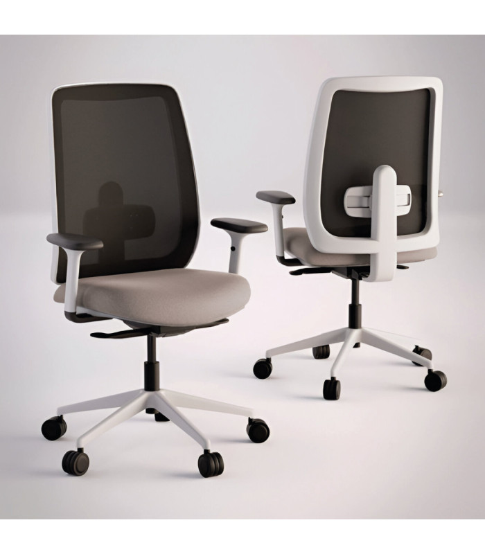 Cadeira de escritório ergonômica, ideal para ambientes de trabalho modernos, projetada para oferecer conforto e suporte durante longas jornadas. Possui encosto em malha respirável que favorece a ventilação, assento acolchoado de alta densidade para maior conforto e estrutura branca resistente com base giratória e rodízios suaves. Inclui ajuste de altura e apoios de braço ergonômicos que ajudam a manter uma postura correta, reduzindo a fadiga e aumentando a produtividade em escritório ou home office.