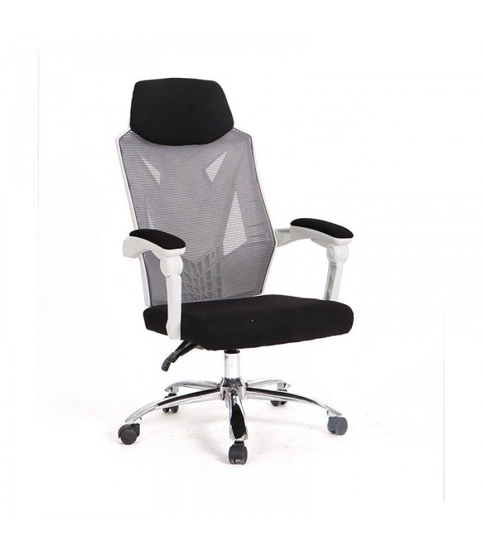 Cadeira de escritório moderna com estrutura de polipropileno em preto ou branco, mecanismo de sincronização, regulagem de altura por pistão a gás, base cromada com rodízios macios. O encosto é estofado em malha preta ou cinza, enquanto o assento e o apoio de cabeça são em tecido preto. Suas dimensões são: largura de 69 cm, profundidade de 61 cm e altura ajustável entre 112 e 122 cm.