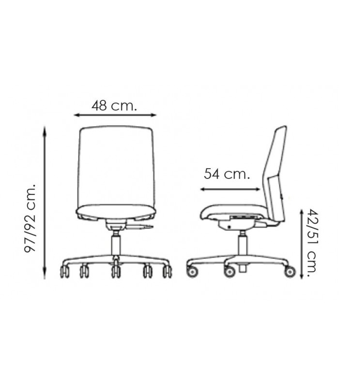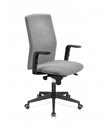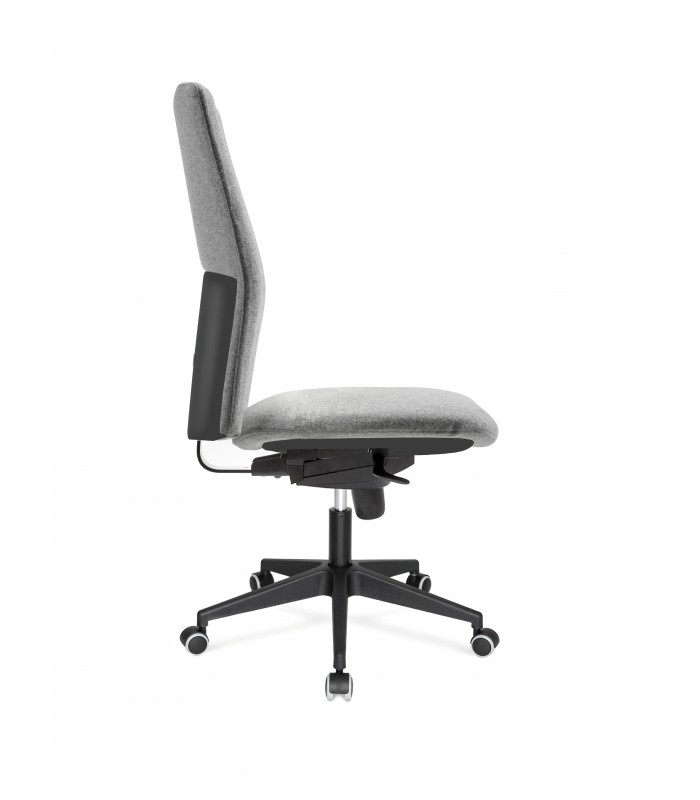 Silla giratoria de respaldo anatómico, tapizado. Mecanismo SINCRO, movimiento de asiento y respaldo sincronizado. Respaldo con regulación de altura por cremallera, sistema anti-retorno, regulación de presión y carcasa exterior con embellecedor cromado. Acolchado en poliuretano de alta densidad en asiento e inyectado en el respaldo. Regulación de altura mediante columna neumática. Base giratoria en poliamida reforzados con fibra de vidrio. Ruedas de rodadura blanda de Ø 50 mm.