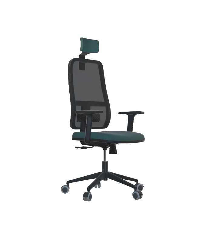 Silla giratoria de respaldo ergonómico alto de malla 3D. Mecanismo SINCRO, movimiento de asiento y respaldo sincronizado. Respaldo con apoyo lumbar regulable, sistema anti-retorno y regulación de presión. Acolchado en poliuretano de alta densidad en asiento. Regulación de altura mediante columna neumática. Base giratoria piramidal en poliamida negra de cinco radios reforzados con fibra de vidrio.