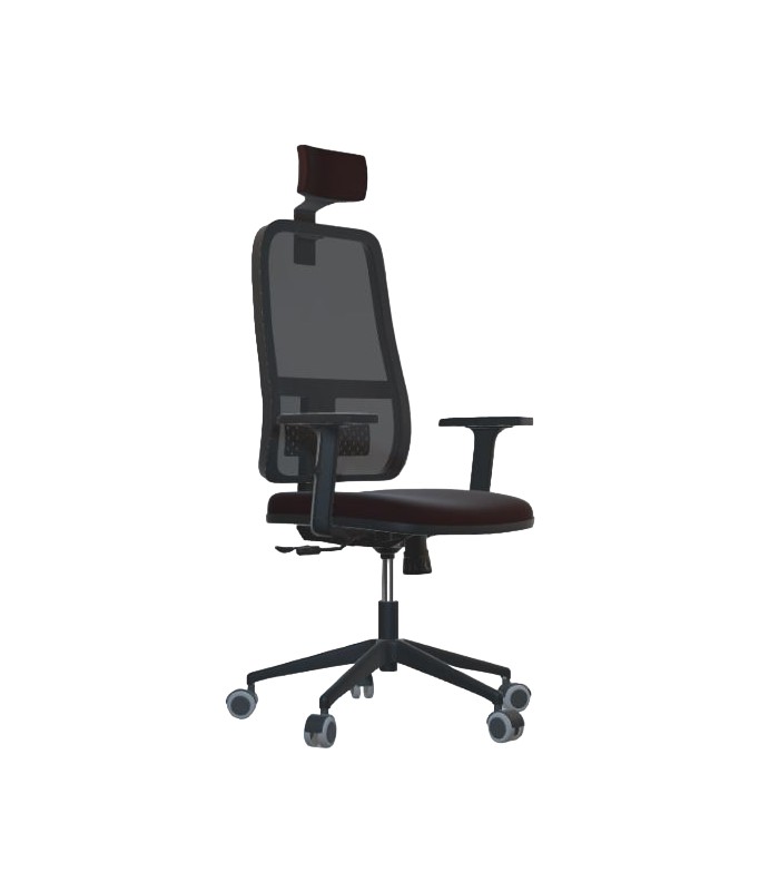 Silla giratoria de respaldo ergonómico alto de malla 3D. Mecanismo SINCRO, movimiento de asiento y respaldo sincronizado. Respaldo con apoyo lumbar regulable, sistema anti-retorno y regulación de presión. Acolchado en poliuretano de alta densidad en asiento. Regulación de altura mediante columna neumática. Base giratoria piramidal en poliamida negra de cinco radios reforzados con fibra de vidrio.