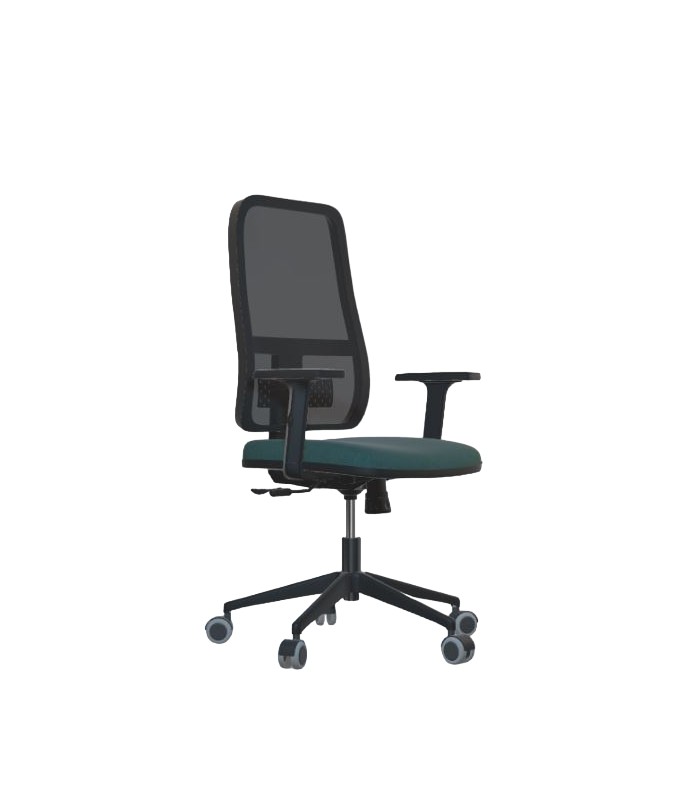 Silla giratoria de respaldo ergonómico alto de malla 3D. Mecanismo SINCRO Movimiento de asiento y respaldo sincronizado. Respaldo con apoyo lumbar regulable, sistema anti-retorno y regulación de presión. Acolchado en poliuretano de alta densidad en asiento. Regulación de altura mediante columna neumática. Base giratoria piramidal en poliamida negra de cinco radios reforzados con fibra de vidrio.