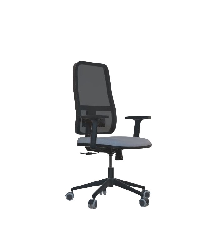 Silla giratoria de respaldo ergonómico alto de malla 3D. Mecanismo SINCRO Movimiento de asiento y respaldo sincronizado. Respaldo con apoyo lumbar regulable, sistema anti-retorno y regulación de presión. Acolchado en poliuretano de alta densidad en asiento. Regulación de altura mediante columna neumática. Base giratoria piramidal en poliamida negra de cinco radios reforzados con fibra de vidrio.