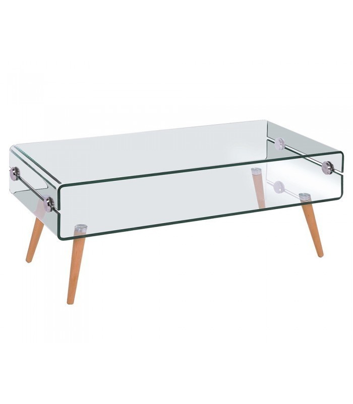 Mesa auxiliar retangular de design que combina madeira com vidro, com prateleira dupla para mais espaço. Seu design de formas arredondadas confere uma imagem mais moderna e é fácil de compor em um canto, encaixando perfeitamente ao lado de uma área de passagem ou de espera em nosso escritório.