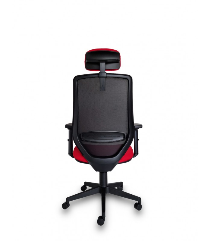 Encosto: Estrutura de polipropileno, com malha ignífuga ultra-resistente acrílica disponível em preto. Respirável e ergonomicamente adaptável. Inclui apoio lombar regulável em altura.