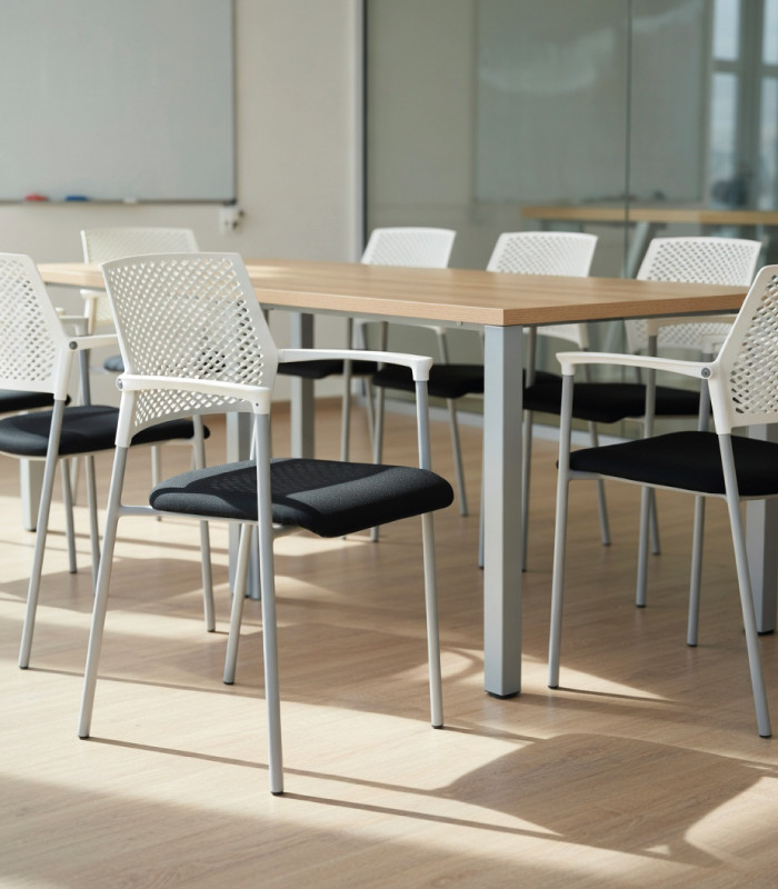 Solución perfecta para salas de reunión y su uso como silla confidente y multiusos. Es una silla de estilo minimalista, moderno y además es apilable. El asiento acolchado y tapizado textil de color negro, acompañado del respaldo perforado, para una mejor transpiración de la espalda, le dan la perfecta armonía para una silla confidente o para usar en salas de juntas, también en recepciones o salas de espera. Se vende en pack indivisible de 4 unidades por color.