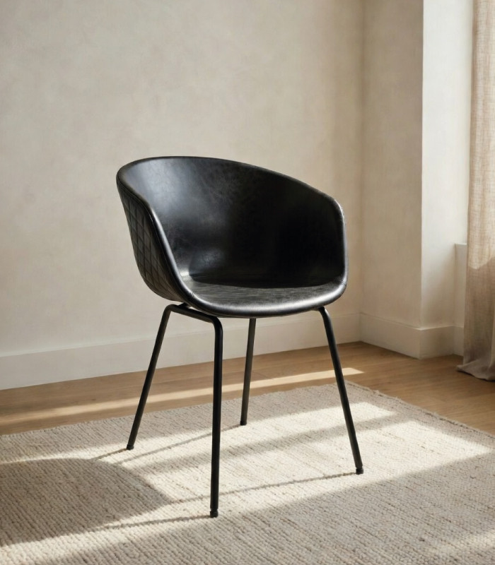 Silla de oficina, armazón metálico con acabado epoxi negro. Asiento y respaldo de forma redondeadas, tapizados en similpiel con colorido variado, exterior con costuras de rombos. Fácilmente adaptable como silla confidente o de visitas en mesas de oficina, también en mesas de reunión o salas de espera. Es una silla que encaja en el entorno laboral con una agradable sensación de que es moderna y adaptable al espacio.