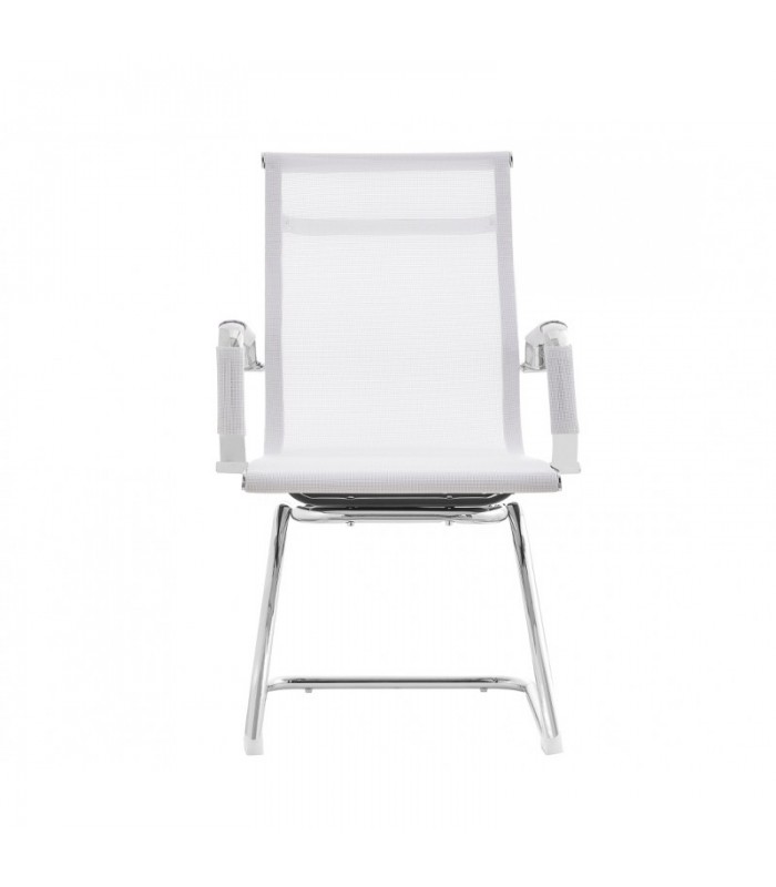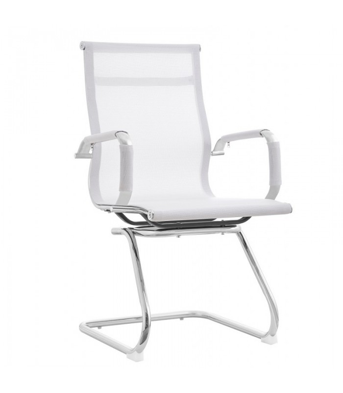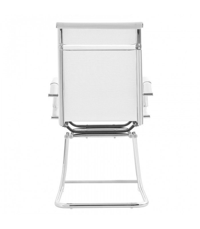 Este sillón de diseño presenta un respaldo medio y fijo con una base patín. Su estructura y brazos están elegantemente cromados y cuentan con fundas en los reposabrazos. La base del sillón es tubular y también cromada. El tapizado está disponible en malla blanca o negra. Además, ofrecemos opciones a juego, incluyendo un sillón alto de dirección y un sillón medio giratorio que complementan este modelo.