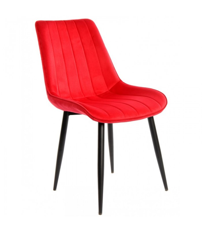 Silla de diseño con un armazón metálico con acabado en epoxi negro y tapizado en velvet. Con diseño que tiene un estilo sobrio y cómodo por su especial acolchado del asiento y respaldo, con costuras verticales. Es una silla polivalente, tanto para usar como confidente como para su uso en salas de espera, recepciones o incluso en salas de juntas.
