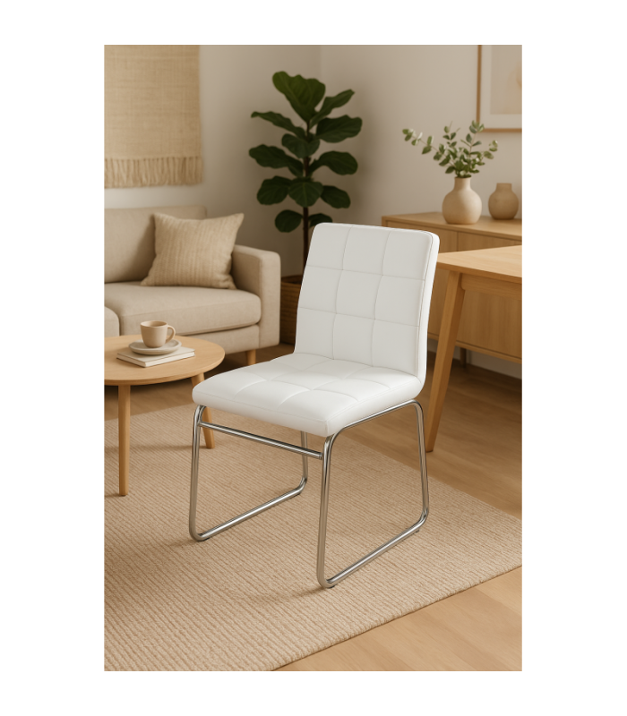 Dale un toque de estilo y elegancia a tu espacio con esta moderna silla tapizada en símil piel blanca. Su diseño contemporáneo con estructura cromada aporta un aire sofisticado y luminoso, perfecto para comedores, oficinas o salas de reunión. El asiento y respaldo acolchados ofrecen una comodidad excepcional, ideal para disfrutar de largas sobremesas o jornadas de trabajo. Una pieza versátil, resistente y fácil de limpiar que combina a la perfección diseño y funcionalidad.