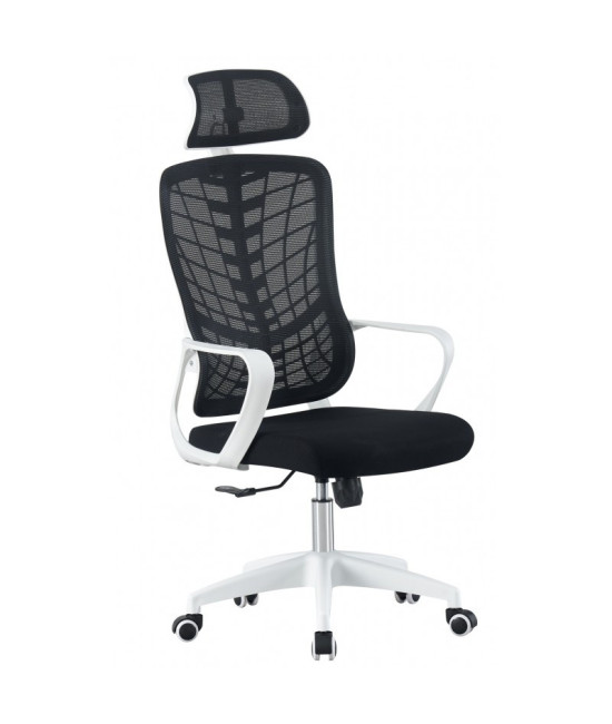 Eleva tu espacio de trabajo con esta silla de oficina de diseño moderno y ergonómico. Su respaldo alto en malla negra o gris ofrece transpirabilidad y un soporte lumbar natural que se adapta a la forma de tu espalda, brindando mayor confort durante la jornada laboral. Cuenta con cabecera ajustable para un apoyo extra en cuello y cabeza, asiento acolchado en tela negra o gris para mayor comodidad y una base giratoria con ruedas que facilita el movimiento. Los reposabrazos fijos le dan un toque elegante y minimalista. Ideal para oficinas, salas de reuniones o espacios de home office con estilo.