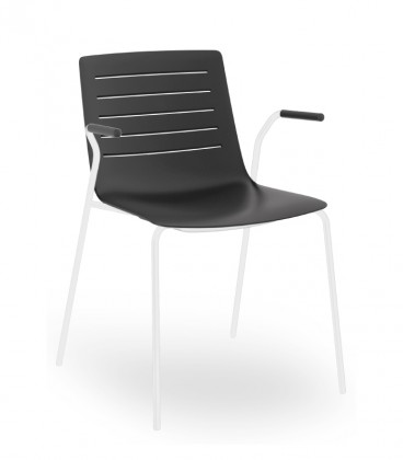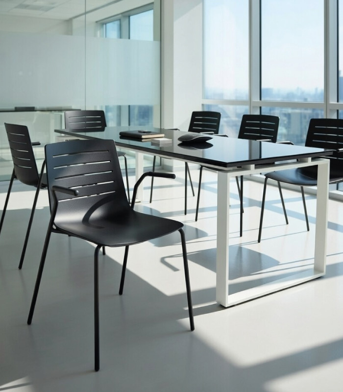 Silla moderna y minimalista, ideal para espacios multifuncionales como oficinas, comedores, salas de espera, salas de reunión, salas de formación, conferencias. Este modelo cuenta con un asiento y respaldo de polipropileno inyectado de fibra de vidrio, con brazos incluídos, perfecto para largas horas de estudio o trabajo. La silla está fabricada con 4 patas de acero, con un acabado en color blanco o negro. Su diseño ergonómico incluye ranuras horizontales en el respaldo, proporcionando ventilación y un toque estilizado.