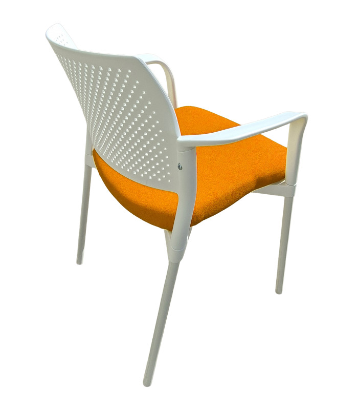 Silla de oficina ergonómica en polipropileno de alta resistencia con respaldo perforado que maximiza la ventilación y comodidad durante jornadas largas de trabajo. Su asiento acolchado y tapizado en tejido Baly ofrece un soporte mullido y elegante, ideal para oficinas modernas, salas de reuniones, recepciones o home office. Sus amplios reposabrazos y asiento contorneado ofrecen soporte óptimo. Estructura ligera, resistente y apilable, con patas metálicas robustas que garantizan estabilidad y durabilidad. Diseño contemporáneo y funcional que combina estilo profesional con practicidad, perfecta para mobiliario de oficina de calidad a precio competitivo.