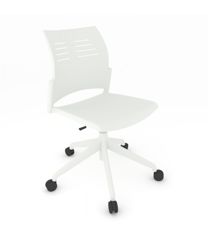 La silla giratoria SPACIO sin brazos combina simplicidad y robustez en su estructura y funcionalidad. Su diseño y la gran variedad de colores combinados la hace perfecta para su uso en espacios como aulas de formación, salas de conferencias y colectividades. Está fabricada en polipropileno de alta calidad. Su base, con elevación a gas, está fabricada en poliamida en acabado negro o blanco con ruedas.