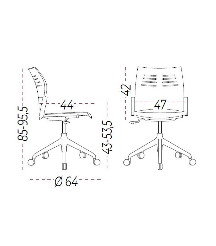 - La base del giratorio es de poliamida con 5 radios de 64 cm de diámetro, en acabado negro o blanco on ruedas silencionsas de poliamida en negro.