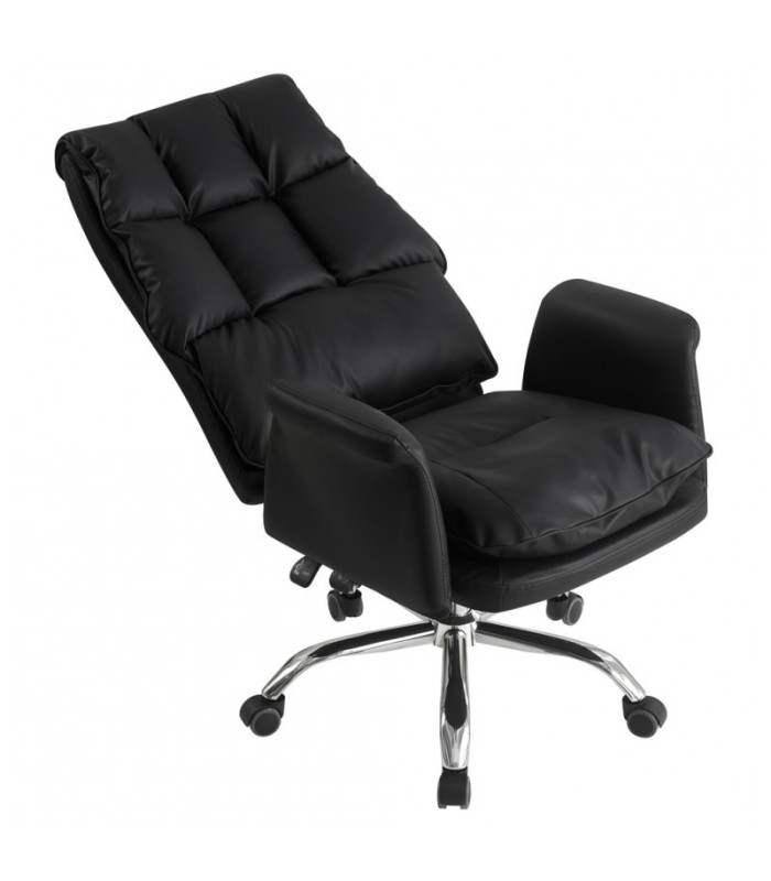 Sillón de oficina ejecutivo de diseño moderno y elegante, ideal para oficinas, despachos profesionales y espacios de trabajo en casa. Fabricado en similpiel de alta calidad, ofrece un acabado sofisticado, fácil de limpiar y resistente al uso diario. Su respaldo alto con acolchado mullido proporciona un excelente soporte lumbar y cervical, ayudando a mantener una postura cómoda durante largas jornadas de trabajo. Incorpora un sistema de ajuste de altura mediante pistón de gas para adaptarse fácilmente a diferentes escritorios y usuarios. La base cromada con ruedas multidireccionales garantiza estabilidad, movilidad suave y durabilidad sobre distintos tipos de suelo.