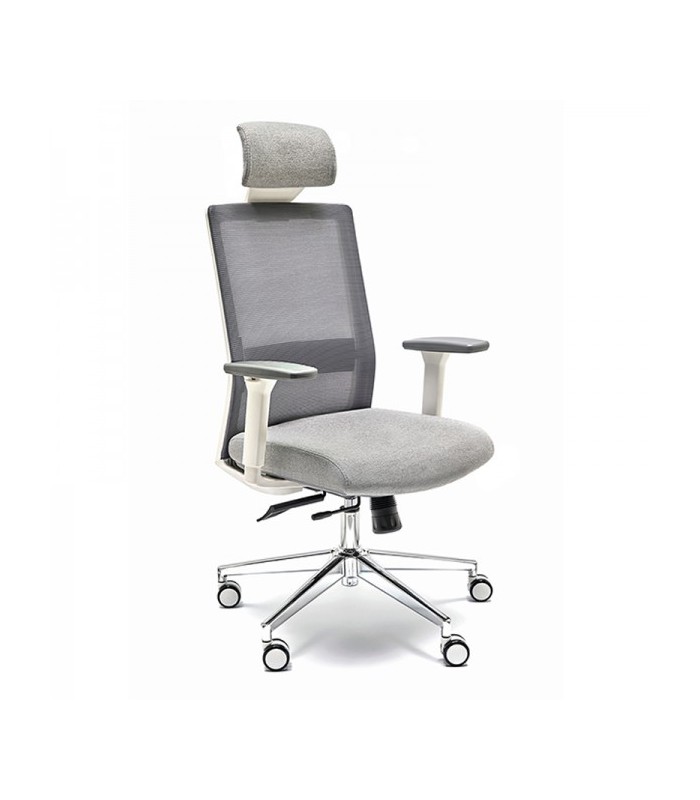 Silla giratoria de oficina, con cabezal incorporado. Fabricada en dos versiones de carcasa en color blanco o negro. El respaldo de malla efecto tela, a elegir color gris o negro, con cabezal regulable en altura, acolchado y tapizado. La traslación de asiento de serie le hacen ser una de las sillas más cómodas y que mejor ergonomía alcanza con todos los mecanismos que ofrece. Es elegante y con el colorido ideal para uso en despacho o como silla operativa de oficina.