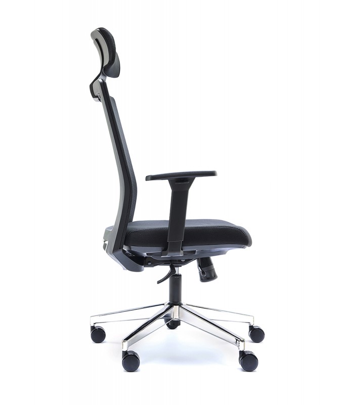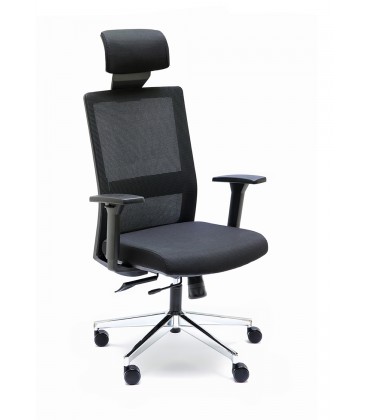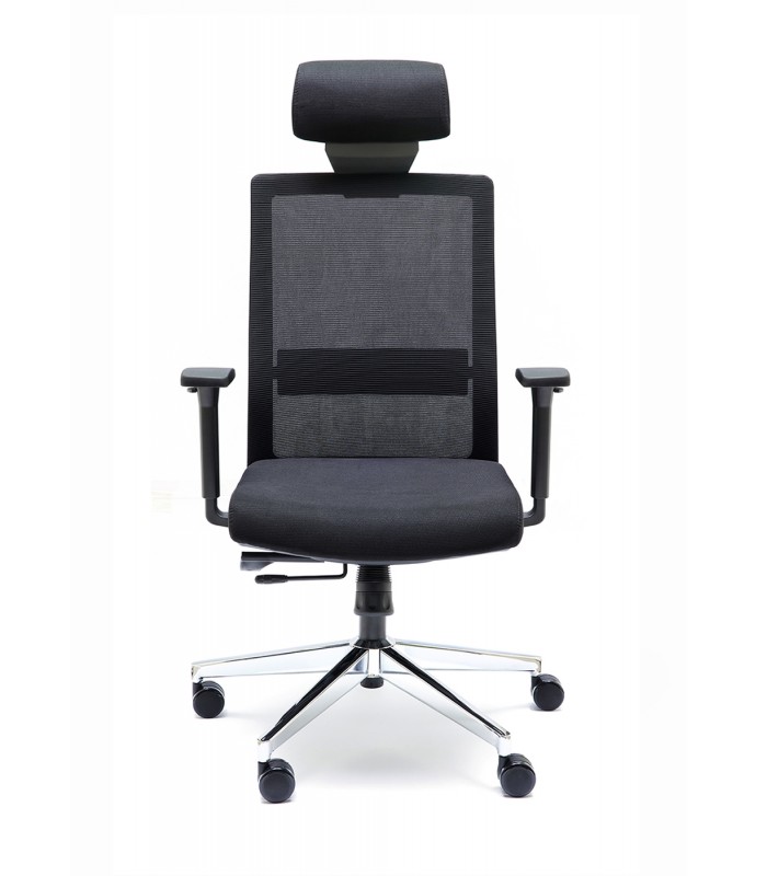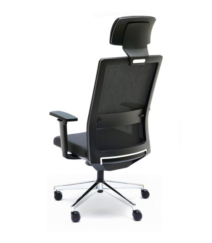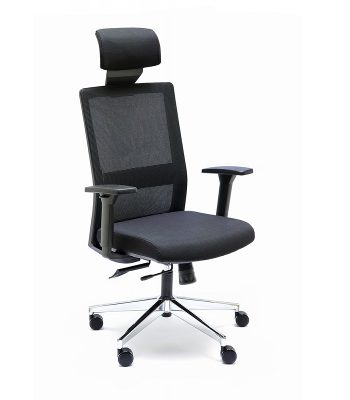 Silla giratoria de oficina, con cabezal incorporado. Fabricada en dos versiones de carcasa en color blanco o negro. El respaldo de malla efecto tela, a elegir color gris o negro, con cabezal regulable en altura, acolchado y tapizado. La traslación de asiento de serie le hacen ser una de las sillas más cómodas y que mejor ergonomía alcanza con todos los mecanismos que ofrece. Es elegante y con el colorido ideal para uso en despacho o como silla operativa de oficina.