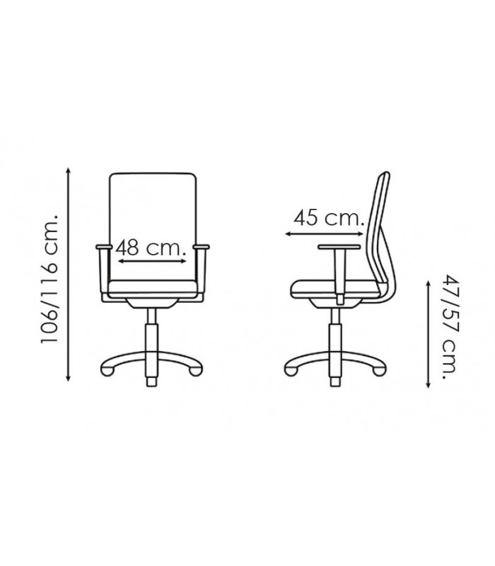 Silla giratoria de respaldo ergonómico con brazos 1D. Mecanismo SINCRO, movimiento de asiento y respaldo sincronizado. Respaldo regulable en altura por cremallera, sistema anti-retorno y regulación de presión. Acolchado en poliuretano de alta densidad en asiento y respaldo. Regulación de altura mediante columna neumática. Base giratoria piramidal en poliamida reforzados con fibra de vidrio. Ruedas de rodadura blanda de Ø 50mm.