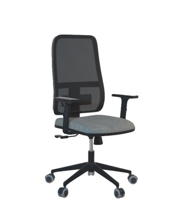 Silla giratoria de respaldo ergonómico alto de malla 3D. Mecanismo SINCRO, movimiento de asiento y respaldo sincronizado. Respaldo con apoyo lumbar regulable, sistema anti-retorno y regulación de presión. Acolchado en poliuretano de alta densidad en asiento. Regulación de altura mediante columna neumática. Base giratoria piramidal en poliamida negra de cinco radios reforzados con fibra de vidrio.