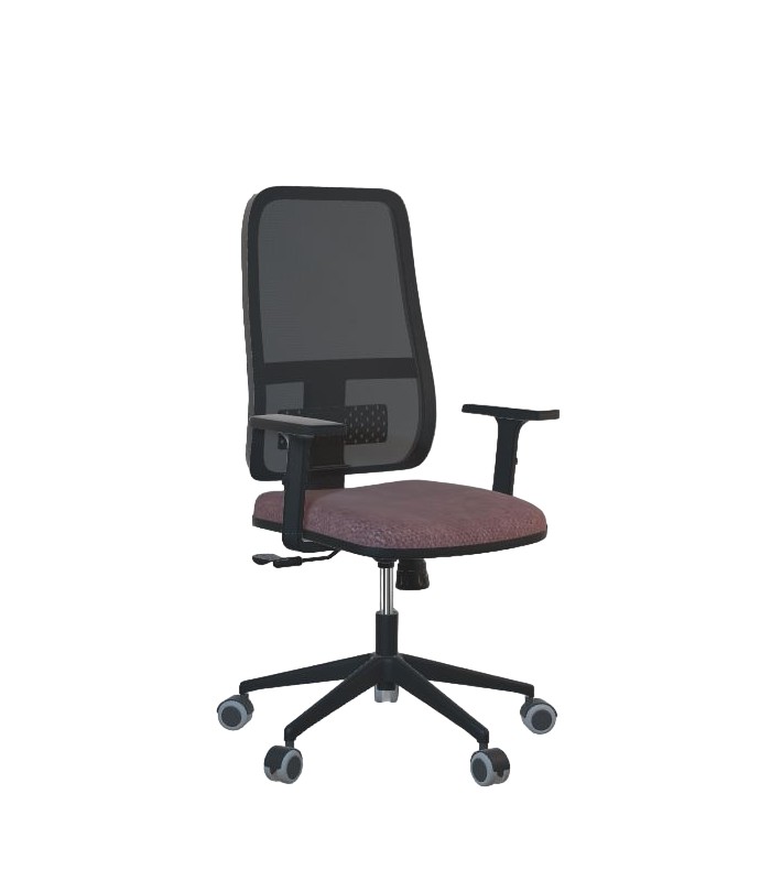 Silla giratoria de respaldo ergonómico alto de malla 3D. Mecanismo SINCRO, movimiento de asiento y respaldo sincronizado. Respaldo con apoyo lumbar regulable, sistema anti-retorno y regulación de presión. Acolchado en poliuretano de alta densidad en asiento. Regulación de altura mediante columna neumática. Base giratoria piramidal en poliamida negra de cinco radios reforzados con fibra de vidrio.
