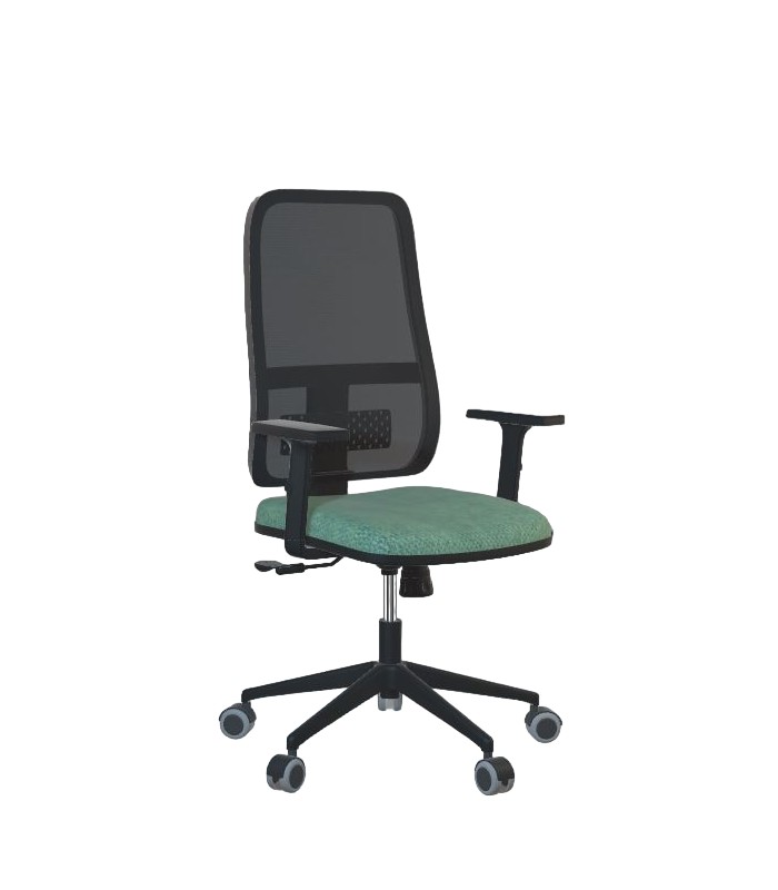 Silla giratoria de respaldo ergonómico alto de malla 3D. Mecanismo SINCRO, movimiento de asiento y respaldo sincronizado. Respaldo con apoyo lumbar regulable, sistema anti-retorno y regulación de presión. Acolchado en poliuretano de alta densidad en asiento. Regulación de altura mediante columna neumática. Base giratoria piramidal en poliamida negra de cinco radios reforzados con fibra de vidrio.