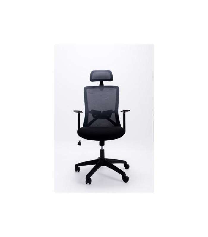 Con una estética moderna y avanzada, esta silla de oficina aporta una visión actual a la vez que muy funcional al entorno laboral. Tiene el asiento acolchado tapizado en tejido negro, estructura interna del asiento en madera, estructura exterior en polipropileno negro, cabezal decorativo basculante en el respaldo, sistema basculante, regulador de tensión, elevación a gas, brazos de polipropileno, base de nylon con ruedas.