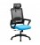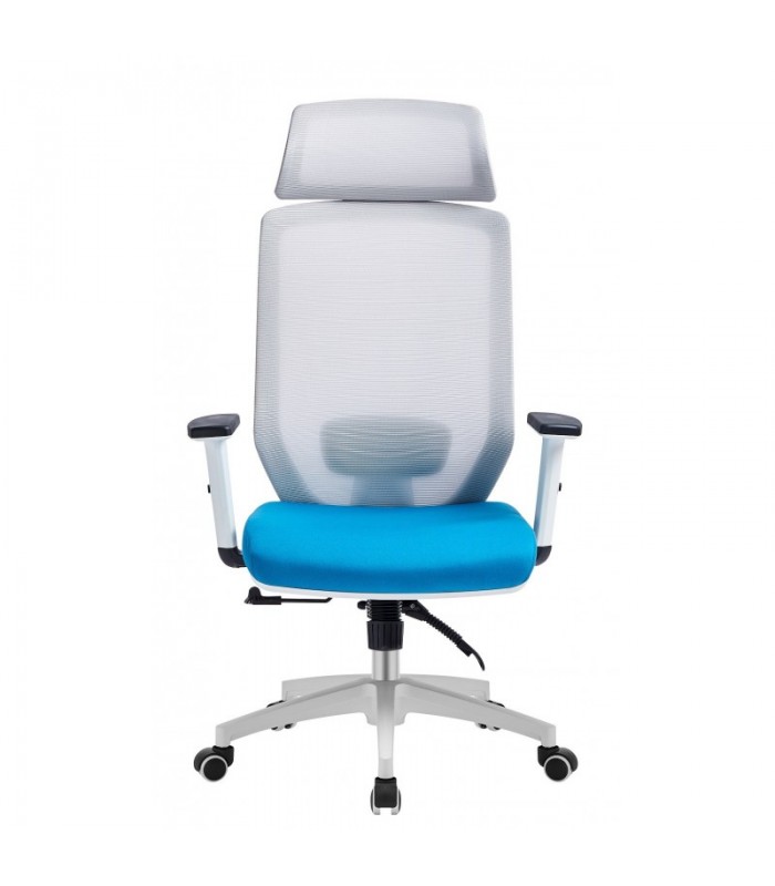 El sillón de oficina moderno con cabezal cuenta con elevación por pistón a gas y un mecanismo de sincronización con mando y regulación. Su armazón y base están fabricados en polipropileno reforzado con fibra de vidrio en color negro o blanco. Los brazos son regulables en altura. El respaldo está tapizado en malla con diseño horizontal en color negro o gris, mientras que el asiento está fabricado en tejido acrílico en color negro, rojo o azul.