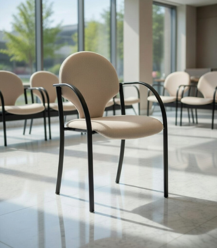 Silla disponible en tapizado textil Leo en varios colores. Con una estructura en la que los brazos van integrados en ella, es una silla que aporta un extra de seguridad y fortaleza. El asiento y respaldo están acolchados y tapizados en textiles de gran calidad, con un extraordinario colorido, moderno y que puede complacer todas las necesidades de tapizado de una silla de este tipo, bien para su uso como silla de oficina confidente, como para su uso en salas de reunión, zonas comunes, recepciones o cualquier espacio en el que una silla cómoda y de buena apariencia sea necesaria. Es una silla fácilmente apilable.