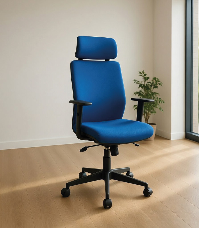 Sillón giratorio de dirección Neus con respaldo alto y cabezal relleno de espuma de alta densidad, al igual que el asiento. Destaca por ser la silla de oficina que tiene un mayor grosor en el acolchado del asiento, que es con espuma inyectada, lo que proporciona un mayor confort que la goma espuma, y con una densidad, máxima, de 65 Kg/m3. Una silla muy recomendable para su uso continuado en jornadas de trabajo donde se pasan largas horas sentados. El respaldo, también acolchado y tapizado integral en textil Basic, los brazos regulables en altura y el mecanismo sincro, le conjuntan todo lo necesario para ser una de las sillas más demandada por su comodidad y ergonomía.
