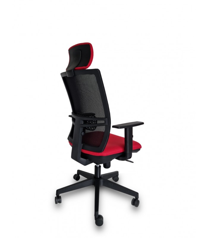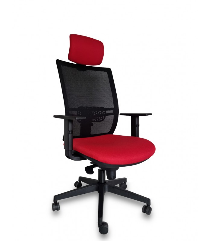 Silla de oficina ergonómica con respaldo de malla resistente, con cabezal regulable en altura y regulación lumbar ajustable. El asiento tapizado en textil Leo de alta calidad, con colorido a elegir, respaldo en malla de alta resistencia, con regulación lumbar regulable. Una silla que ofrece un alto índice de ergonomía con un precio excelente. La calidad de los materiales, el diseño cuidado hasta el último detalle, la convierten en una gran apuesta para puestos operativos en los que se pasan largas jornadas de trabajo y en los que hay que cuidar mucho que la postura sea correcta.