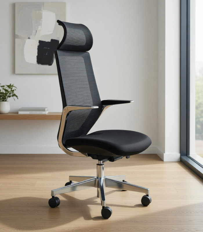 - Respaldo alto con opción de cabecero, tapizado en malla efecto tela de alta calidad.