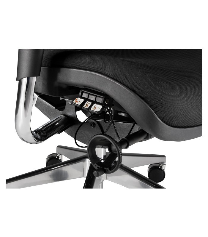 - Respaldo regulable en altura, tapizado en malla técnica muy resistente de color negro, con soporte lumbar integrado en respaldo.