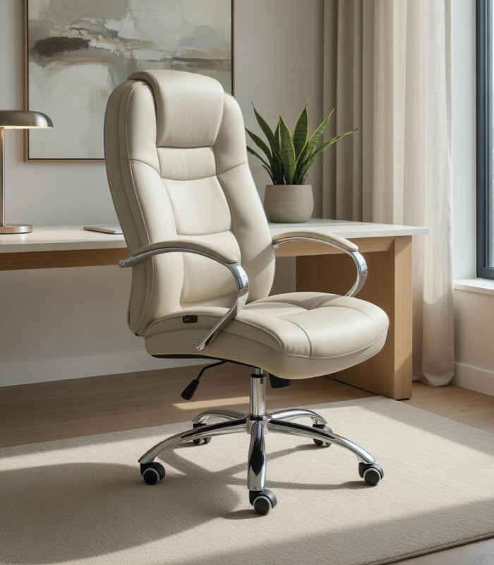 El sillón giratorio de dirección Mauro se caracteriza por su voluptuoso diseño que no compromete la armonía de sus asientos y respaldo acolchados, brindando una gran comodidad. Es una elección atemporal tanto para despachos de dirección como para espacios de trabajo en el hogar, ya que su estética sugiere su uso en zonas destinadas al trabajo. Su acolchado integral lo distingue de los modelos con respaldos más livianos.