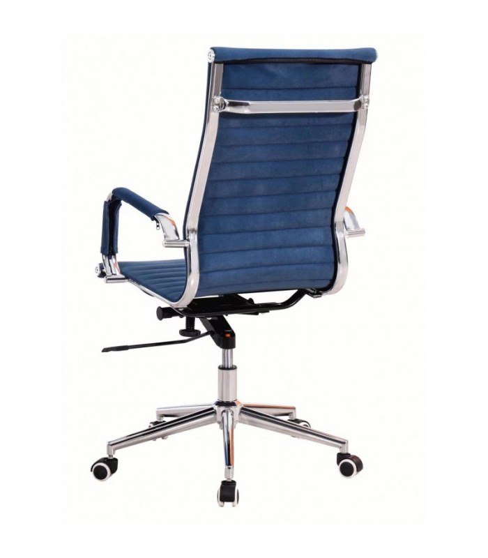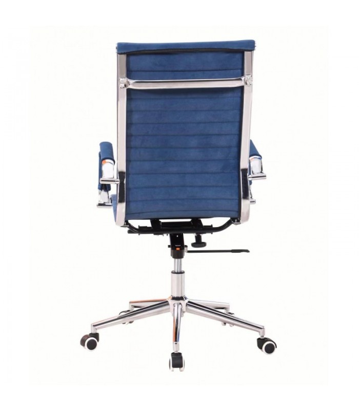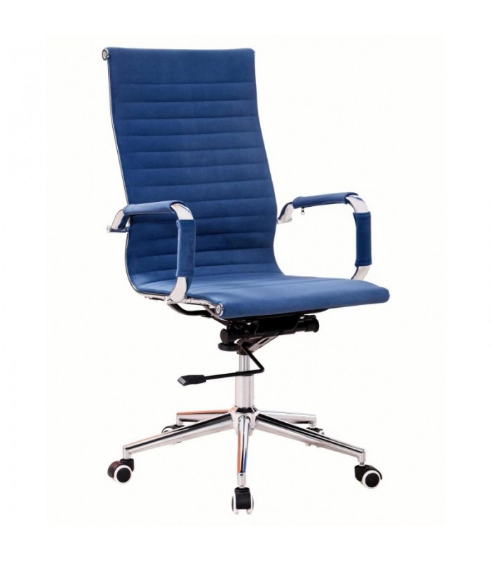 Sillón de dirección de respaldo alto, con elevación por pistón de gas y mecanismo de basculante profundo. La estructura y brazos cromados, la base de acero cromada y resistente y el gran tapizado en tejido textil azul, hacen de él un sillón apto y con la estética propia de un sillón de dirección y también muy accesible para su uso como silla giratoria operativa. No pasará desapercibida por su elegancia y el color de su tejido con cosidos horizontales.