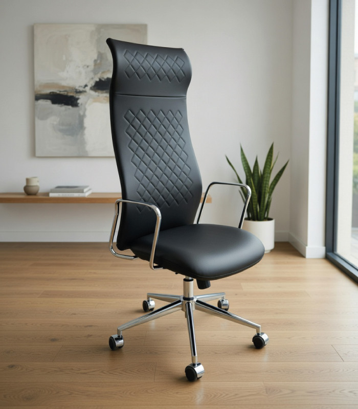 Sillón giratorio elegante, de estilo moderno, ideal para cualquier despacho y está tapizado en piel ecológica llamada nappel. Un extraordinario modelo, ergonómico, atractivo y con un diseño minimalista que encaja perfectamente en los despachos de dirección que quieran un extra de vanguardia y estilo, que se adapta perfectamente en cualquier perfil de despacho de dirección.