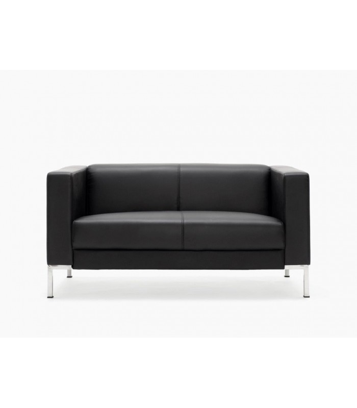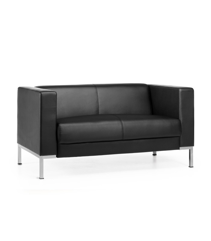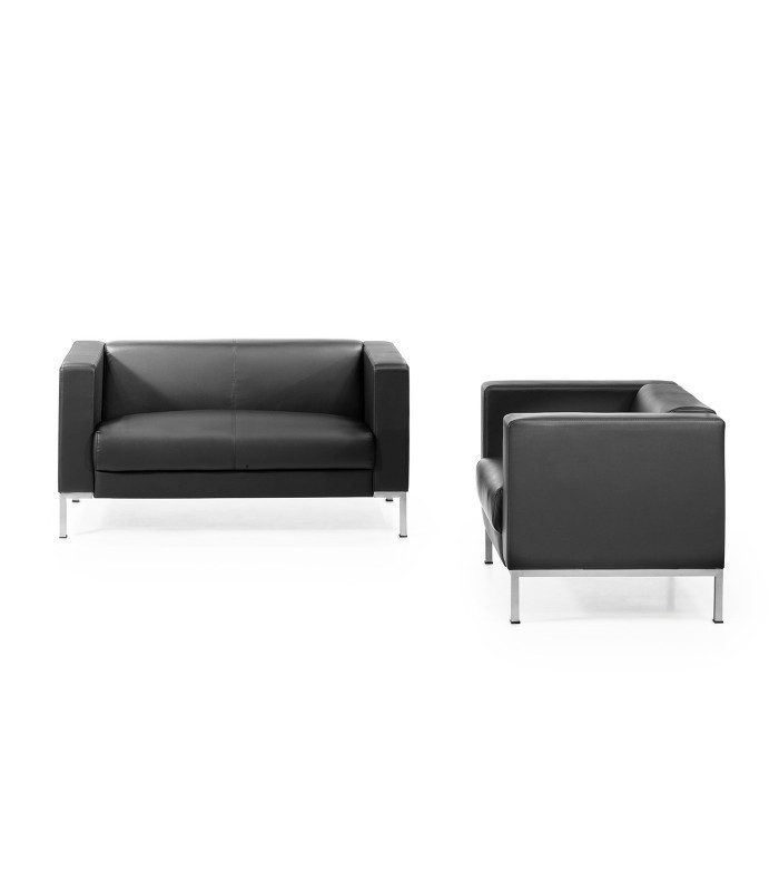 Sofá de 2 plazas para sala de espera o despacho, tapizado en polipiel negra. De líneas fluidas y minimalistas que marcan la diferencia. Solución perfecta para zonas de espera, descanso y reunión. El uso de sillón, en conjunto con el sofá a juego, se ha impuesto como un complemento perfecto en los despachos de alta dirección.